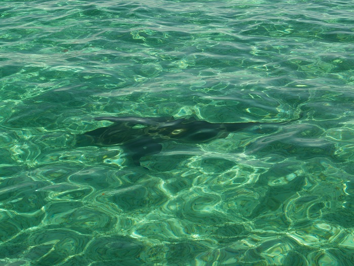 The water here is so clear that you can see at least 100’ so it’s easy to see any “wildlife” that comes near. Generally you don’t see much but yesterday there were two large 8’ long sharks that kept cruising by. This is a not-so-great shot of one that kept coming very close to the boat. Trust me when I say that he was really close, and BIG! I am pretty sure that they weren’t the harmless nurse sharks.