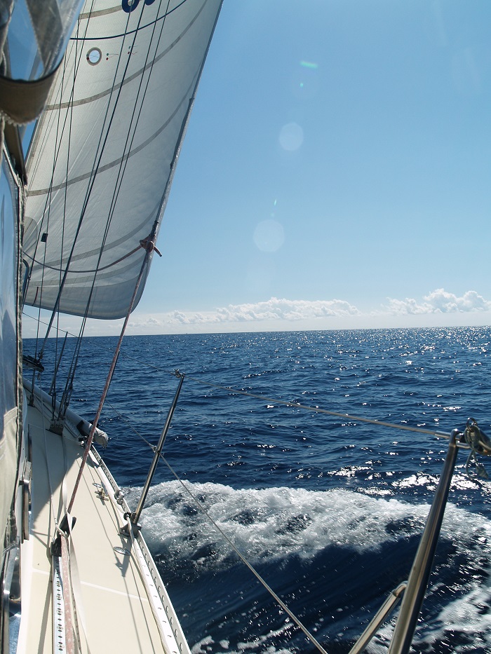 For now, I think I’ll go back up into the cockpit to watch the water go by. Oh yeah, the water here is really deep, over 7,000 feet actually. And the color, the most perfect color of indigo blue. Indigo water with the sun sparkling and an easy breeze. Perfect.