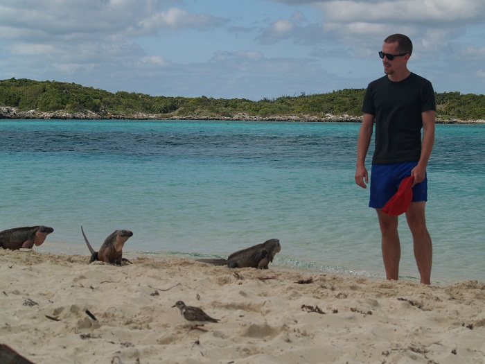 Our first stop on Monday was at Allen Cay, the home of a wonderful population of native iguanas that, for all the world, look like props from a “B” Japanese Godzilla movie.  As you come onto the beach, the lizards come out to look for handouts.  It’s pretty amazing to see 30 or so 3’ long “mini monsters” come out of from the brush.  And sometimes they come pretty close.  Here’s Chris with some admirers.Yesterday we motored a short distance from Allen to Highborne Cay because this island is a bit taller and breaks the wind a bit more.  The currents at Allen are strong challenging and make the boat orient itself oddly to the wind as the tide ebbs and flows against a strong wind.   Here at Highborne, the currents are a lot less so Pandora lies more calmly at anchor, which is much more comfortable.