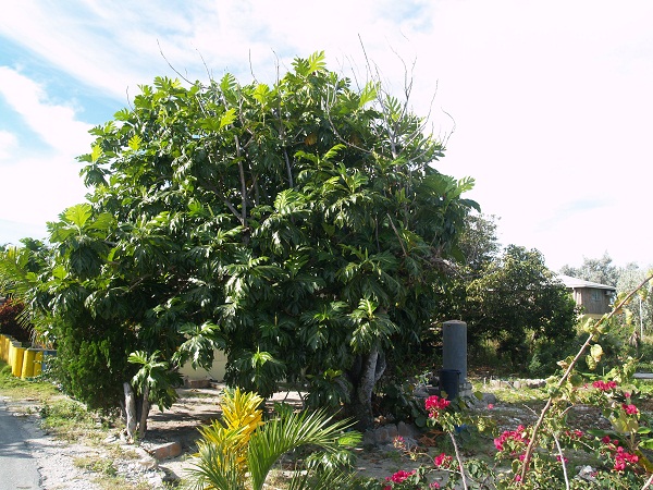 In spite of the trials of Blye and his shipmates, descendants of the breadfruit tree seedlings he was carrying from the Pacific islands made their way to the Bahamas. Here is a photo of one of the larger breadfruit trees on Staniel.