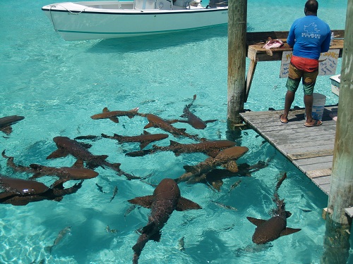 One of the highlights of the island is the large family of “tame” nurse sharks that hang around the docks. As the fisherman clean their catch, the sharks show up from all around for handouts. Nurse sharks are quite harmless and don’t have sharp teeth like other sharks. They actually encourage you to jump in and swim with the sharks. Not sure I have the nerve to do that. The largest of the sharks were about 8′ long. That’s a lot of shark.