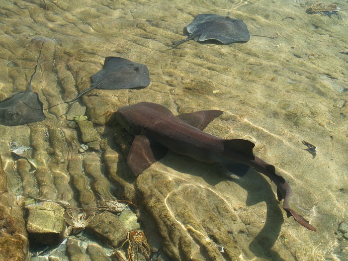 In spite of being in a busy marina, the water is incredibly clear. It almost looks like they are just laying on rock. No, there is some 4’ of water. Really, really clear.