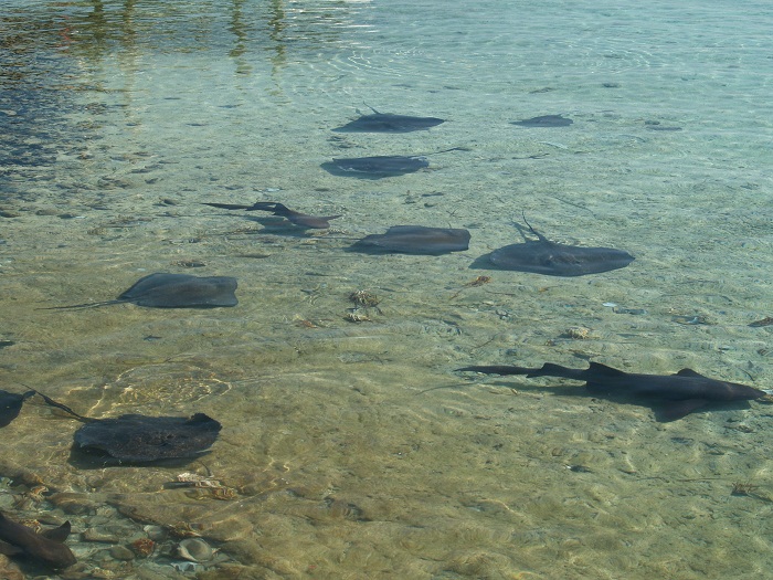 Speaking of local wildlife… Every afternoon the folks at the Staniel Cay Yacht Club (actually it’s not a club at all but I won’t quibble) clean fish and lobster in preparation for dinner. The food there is very fresh and pretty good actually, and the scraps go into the water to feed the local fish population. Sharks and rays come in from all over to enjoy the feast.
