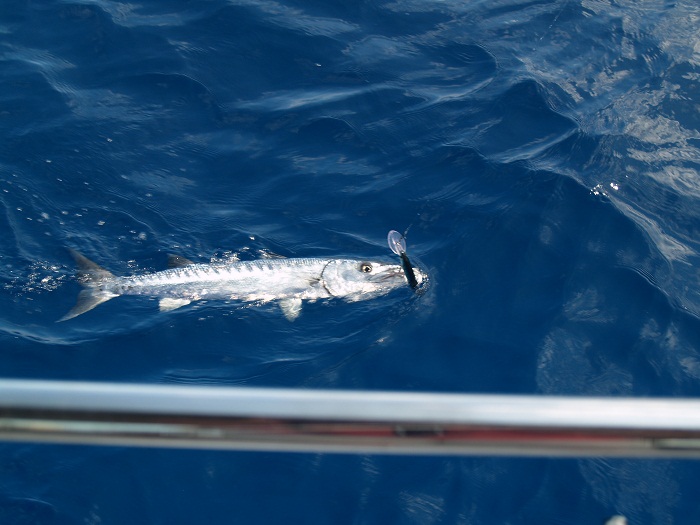 Also, as we motored calmly down the Exumas chain toward Georgetown, we decided to throw out a line to see what we could catch and while we didn’t get a fish that we could eat, we did catch a pretty large Barracuda. These guys are pretty nasty looking with big teeth, about ¾” long. Intimidating.