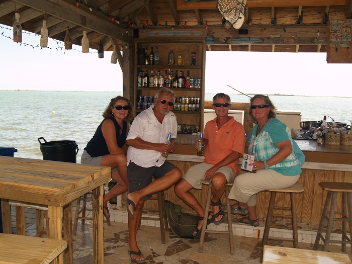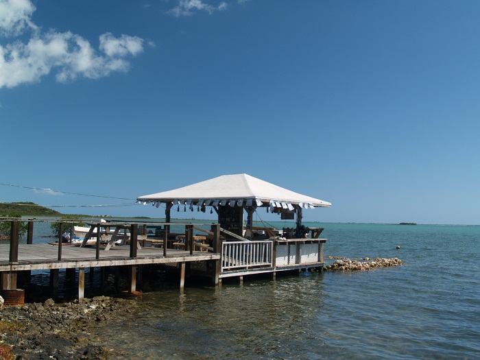 Confident that it was indeed a “good time”, we followed a sign on the side of the road and there it was, “Seaside Village”. Perfect. Actually, the entire “village” consisted of a dock with a bar perched on the end. I guess he could call it a village as there was a half finished guest house, no make that 20% finished, along with a goat and chickens. You heard it, goats and chickens. Here’s the main attraction. The bar.