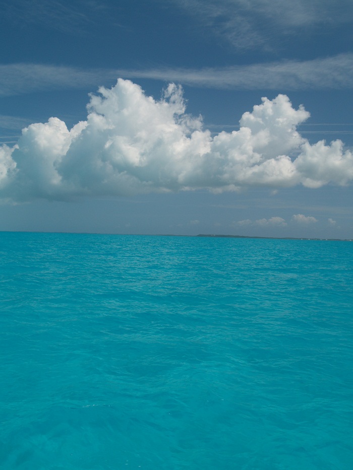 Here’s the view out of the cockpit. Puffy clouds, blue sky and perfectly clear water. Even though we are miles from land it’s less than 20’ deep. Such is sailing on the Bahamas Banks.