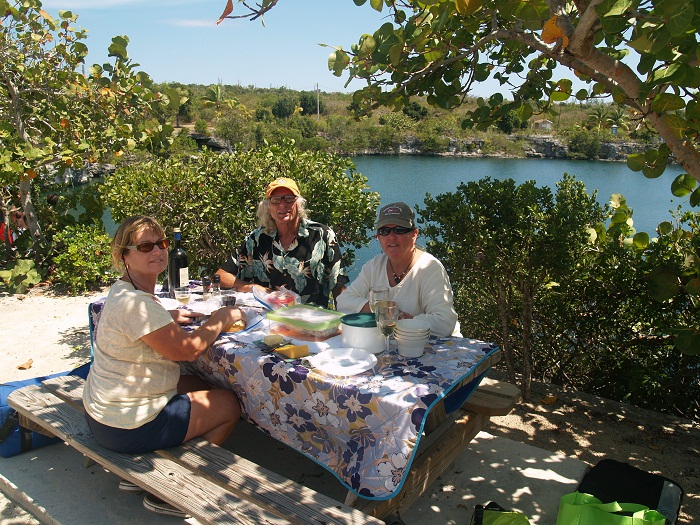 After church we headed back aboard Pandora to prepare a picnic lunch and off to a local park, near a blue hole, a 600’ deep ocean hole right in the middle of town. What a beautiful spot, complete with tropical fish, for a picnic with Maureen and Bill of Kalunamoo. We had a great Easter feast complete with some mahi-mahi that Bill caught off of his boat.