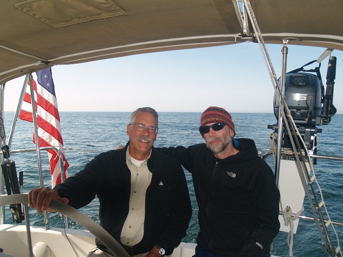 Before Jim jumps ship, I think I’d better post a photo of Pandora’s crew, Jim and Rich, who gave up a week of their lives to help me bring Pandora home. Thanks guys. I made sure that both Jim and Rich cleaned up as best as they could to sit for this photo. Looking a bit shabby? I guess it’s the best they can do after being underway aboard a small boat for a week. Well, they were at least well fed if now “well cleansed”. Please don’t read into the “arm around Jim thing”. It’s not what it seems, really. Pandora’s a happy ship but not that happy.