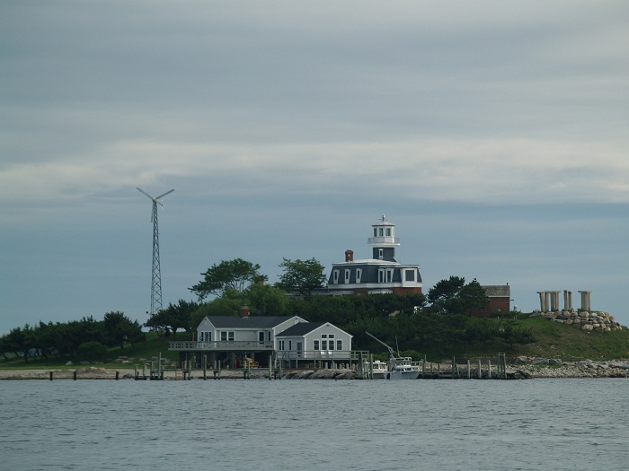Anyway, enough detail. It’s been a while since I have made the run down Buzzard’s Bay, through Block Island Sound and into Long Island Sound. Having spent so many summers moving my boats through these waters , over the last 30+ years, but not recently, it’s a real treat to do it again. I enjoyed seeing one of my favorite island homes perched on what is more of a rocky hump than an island at the entrance to Buzzard’s Bay. I love the wind generator and the “ancient” columns. It’s a nice contrast of the old and new. Pretty nice spot.