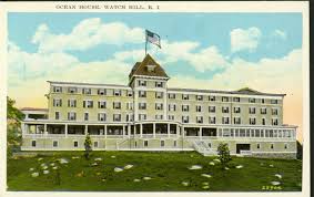 Another beautiful building is the Ocean House Hotel, high up on a bluff in Watch Hill, this beautiful hotel is built on the grounds of a hotel that was built in the early 1900s. The original hotel was open for many years but ultimately closed in 2003 as it was really beyond repair, a victim of age and changing tastes. This is a postcard of the old hotel. Pretty nice.