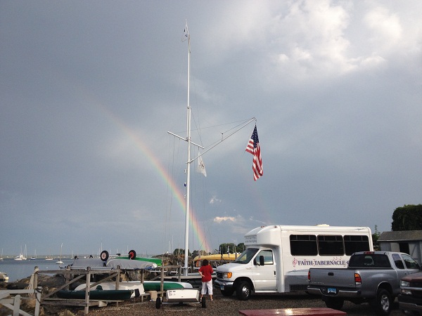 While many came by boat, some arrived via the “Tabernacle Choir Bus” from Essex, owned by one of our members. It seems that the “church bus” is actually a party bus in drag. The “tabernacle choir” is completely fictitious, made up by our member in a jolly moment. I don’t expect that he will be stopped by the “Constabulary“ any time soon. How about this shot of the “sacred” spot framed by a rainbow.