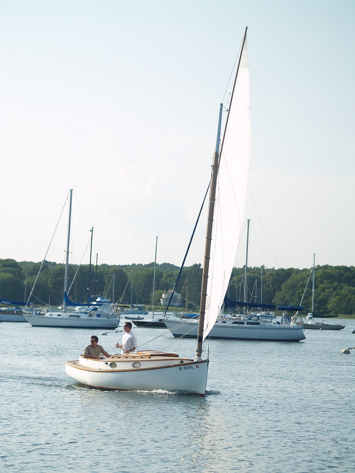 While it’s not Sappho, our old catboat, there are plenty of these little yachts here in Wickford. Here’s one that sailed by the other evening. It’s easy to see how catboats remain so popular.