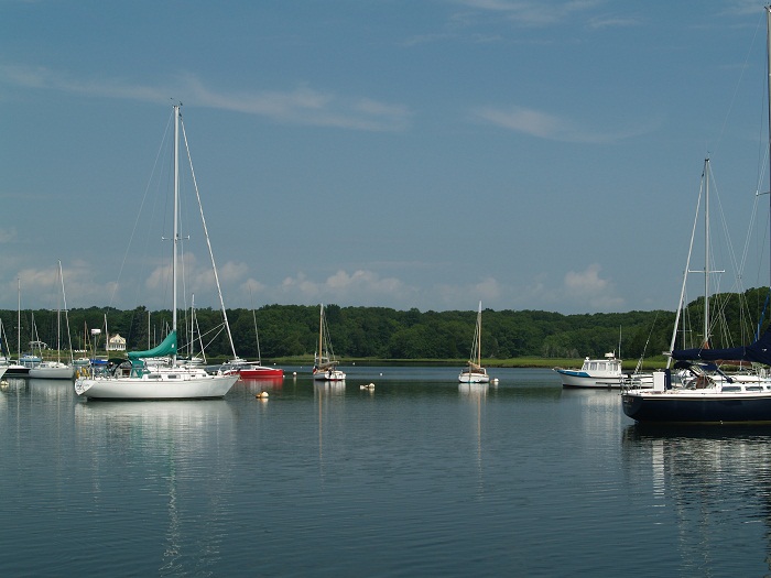 For the last few days we have been on a dock at Pleasant Street Wharf, our favorite spot here in Wickford. It’s a favorite as it’s home to our great friends Eric and Sandy, old time friends, with the emphasis on the “friends” as opposed to “old” from our catboating days. Sappho, a catboat and our second boat, which we sold to Eric over 20 years ago, is still here and in great shape, perhaps better than when we sold her so long ago. Pretty amazing. We had a great dinner with Eric and Sandy the other night. It was fun to reconnect. We hope that they will visit us in CT.