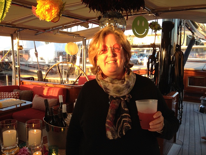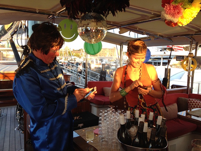 On day two we really saw what Tami and the crew are capable of when they threw a theme party aboard Marie for the racing crew and guests. The regatta hosted a Beatles review band under the main tent so it seemed only natural that Marie would have a 60s Beatles theme too. In fact, they won an award for the best crew theme. Here’s the cockpit all decked out and ready to party. (you can click on the photo to make it full screen)