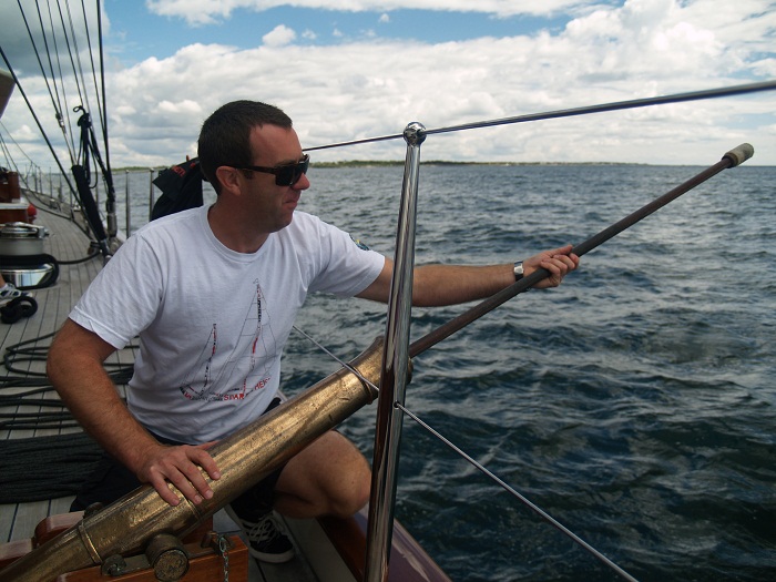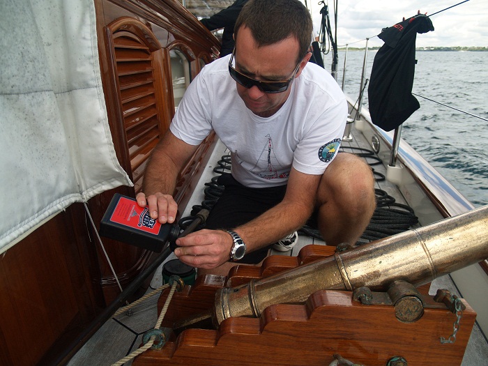 Well, when we were racing in the Newport Bucket Regatta, a few weeks ago, the “mood struck” often. The first time we heard Ed holler, “fire in the hole” was as we were leaving the dock for race one. Everyone instinctively covered their ears (the “ladies” were issued earplugs of course) and BOOOM!!! the cannon “spoke”.