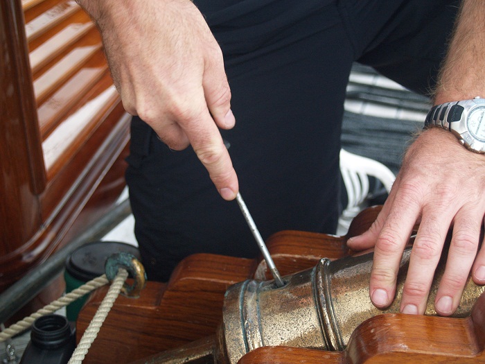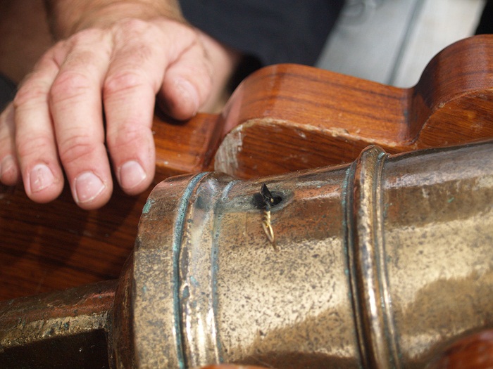 Next, Rich jams a narrow metal rod into the priming hole at the back of the cannon. This allows him to pierce the foil in the charge.
