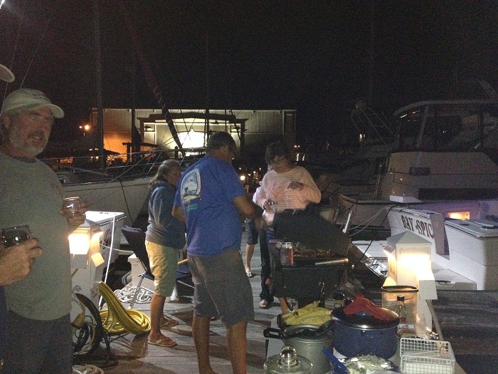 We ended up putting Pandora on the end of a dock with plenty of other boats and as it was the weekend we found ourselves this evening in the midst of a communal dock cookout. We contributed some sausage and to that was added chicken, pork, cobia (whatever that is) as well as tuna and some corn on the cob. All that and pasta salad and all matter of food choices. Someone had even brought pineapple infused rum. Yumm…