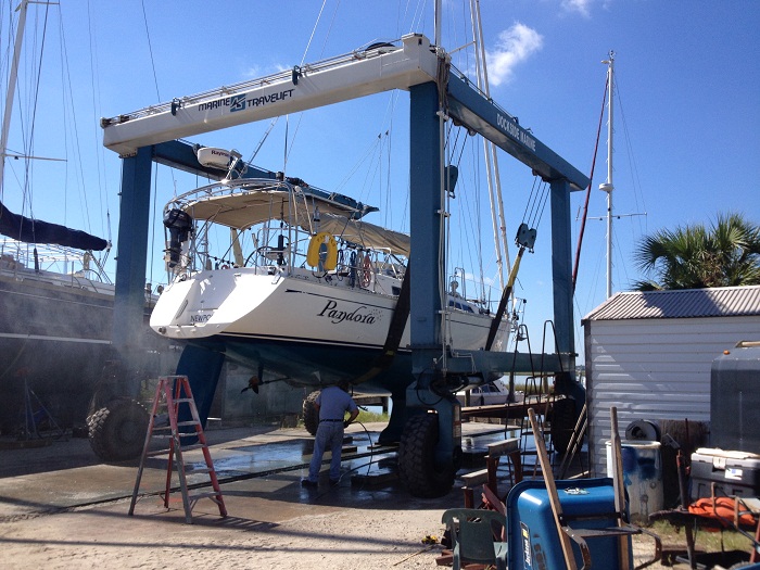 His crane can pick up a boat that weighs in at a hefty 50 tons. Pandora seems pretty heavy to me but she only weighs in at a paltry 30,000 lbs or so. That’s a feather weight 15 tons. Not too hard for Rocky’s lift that can lift something that’s three times as heavy as Pandora.
