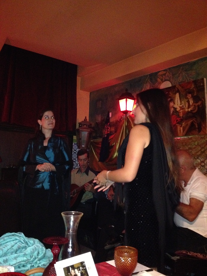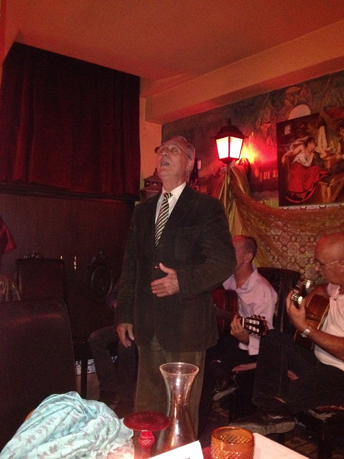 We chose a lovely spot down a narrow staircase below street level. They had live music and some impressive singers took turns belting out Portuguese ballads. This guy one of three that performed, including the owner, had an amazing voice. No, he wasn’t posing to catch a peanut in his upturned mouth. My crappy photo just makes it look that way.