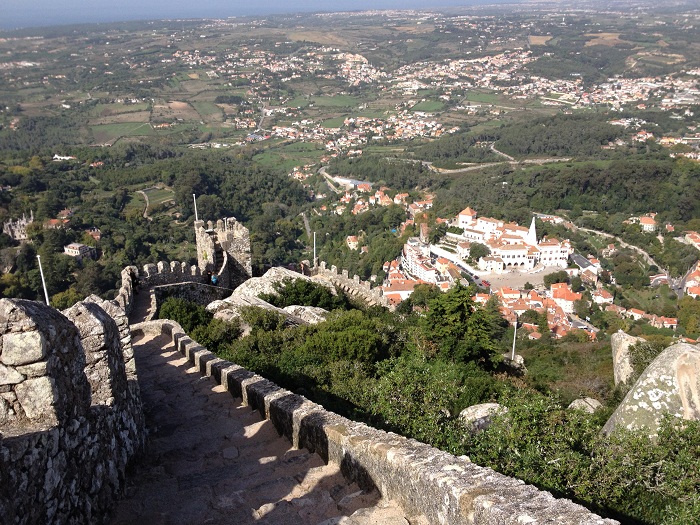 Anyway, towns were built under the watchful eye of the castle.   This is Sintra, viewed from the castle.  In the distance you can see the Atlantic.  The view is really amazing.   I would think that you’d have several days warning if invaders were on their way. The town of Sintra has many lovely buildings.  I enjoyed watching this artist painting in a particularly picturesque spot. Actually, everything here is picturesqueEven the local spring where folks fill up water bottles is pretty. The water at our inn is from a private spring on the property and there is so much water that spigots are left running at times to bleed off the excess.  There is an old cistern that is no longer used out back and now is the home for many goldfish.   The Castelo dos Mouros was built during the 8th and 9th centuries and is quite an impressive place.  I can’t imagine how hard is must have been to lug all that stone around in a time when all you had to work with was brute strength.  It must have taken hundreds of years and many laborers to build it.  I would think that if the local “tough guy” asked for your help, well, you helped and said “how high do you want that wall”.   Yes, that’s a real castle.  Yertle the turtle would have loved it here and he would have been able to see a lot. To walk along the top of these walls would induce vertigo in all but the most bold “knights of old”.  There was a young woman who was sitting on the very top of the wall in this tower and to look at her made me weak in the knees, and not in a good way. It is truly an amazing place.