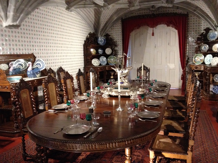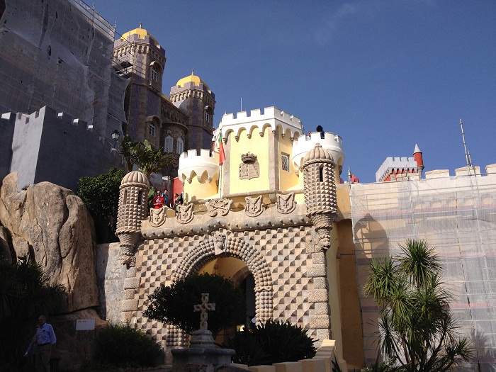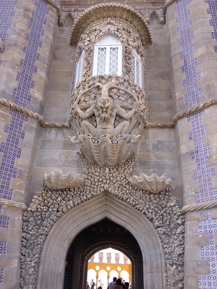 So, fast forward hundreds of years and the then king decided to build a country home on the site of a monastery that was destroyed in an earthquake.   This palace is situated on a mountain top that is EVEN HIGHER than the castle.  No self respecting king would settle for less.   And, it’s a lot more ornate than that nasty old castle.  And for almost 100 years, until it was opened to the public in 1911, it was a home away from home for various kings.  It’s currently undergoing a major restoration.   There is nothing subtle about the Palácio Nacional da Pena.The level of detail is something that only a monarch with access to the national treasury would be capable of.  To arrive through this entrance a king would know that he had indeed arrived and that yes, he also had a LOT of tile. No shortage of bright colors.  I would expect that the castle, in subtle granite tones, would have been painted like this if there had been a Home Depot nearby. I wonder if the king ever polled his subjects asking “What do you think?  Should I go for more earth tones?”Yes, tile everywhere and a really nice courtyard. Charming spot for an intimate dinner.  Perhaps we could take some cues from this for our dinners at home.  Great centerpiece.  Subtle like the rest of the place. Anyway, not a bad spot to visit.  However, it’s a really LONG WAY UP to get there and I would imagine that this was a place that the monarch would only visit for a really LONG weekend.  “Oh Jasper, could you go into town and get me some more port?”  “Yes, right away your Majesty.  I’ll be back in just two days time.”