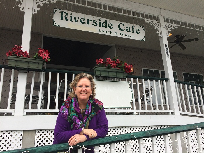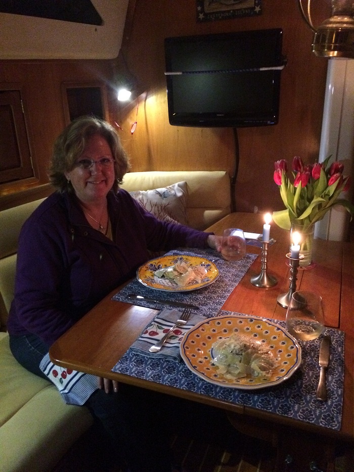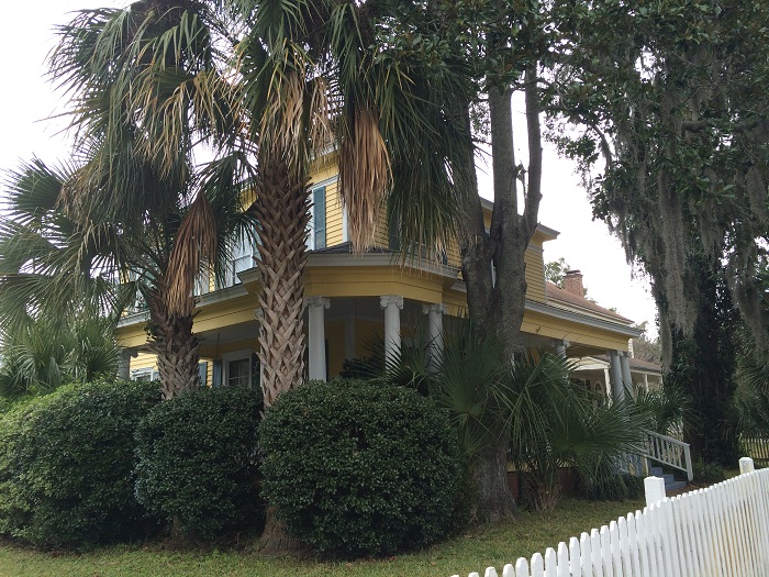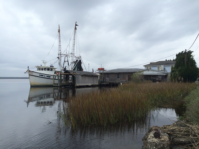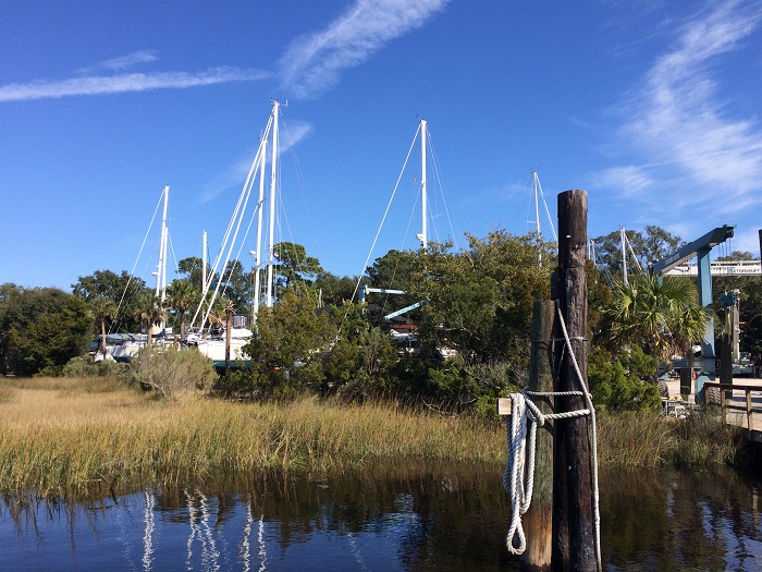On top of all that, there’s a great view of the marsh to boot.  Even Pandora got a good view as she was right near the water.Last night we had a nice simple meal aboard for our first night on Pandora.  It was pretty windy so I can’t say that we slept very well. It always takes a few nights to get used to the noises of being aboard but I am sure that we will settle in in a few days. We went for a nice walk in St Mary’s and then had lunch.  Doesn’t Brenda look great? There are some very pretty homes in town and the live oaks are beautiful.  It’s a bit odd to see camellias in bloom and other flowers budding out in mid January.   You know you are in the south when you see sights like this shrimp boat aside palm trees.After lunch, we headed down the river, with the tide, the 8+ miles to Fernandina Beach where we hope to do some exploring on Monday.  After that we’ll make the 50+ mile run down to St Augustine, one of our favorite cities.