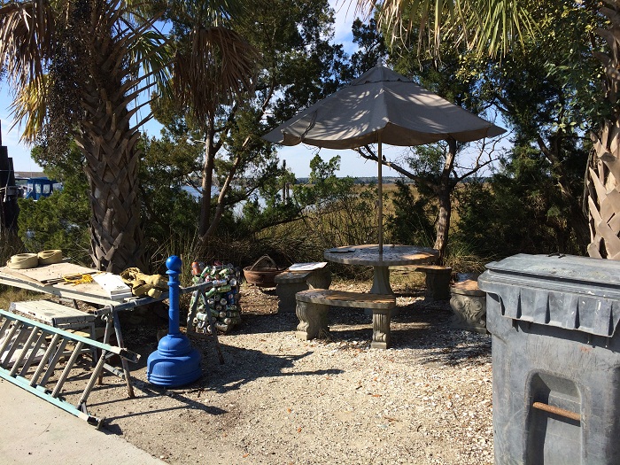 In addition to being very accommodating, the yard provides something that I have never seen in a yard and that’s really fine boarding stairs which I understand are made right in the yard. The design is quite nice, compliments of Rocky’s creative bent.  In fact, they would fit right in as boarding stairs at a small airport. These staircases are made of galvanized steel with wooden treads and there’s even a grate on the bottom tread to knock off the sand from your shoes.  They even put a door mat at the bottom.  Very nice.    How’s this for a “real” boarding ladder?And, if you want to enjoy the view and have a beer at the end of a long day of boat chores, there’s even a sitting area, complete with palm trees.  For the trip south last fall, I had put the dink on deck as I don’t carry it in the davits when we are offshore so had to find a way to get it onto the ground and back up into the davits, with the engine no less.  However Jeff, the do-it-all guy at the marina came to my rescue with his forklift.  What a great idea.   We put the dink on the lift and he picked it up a few feet so that I could install the engine and then lifted it up to deck level so I could attach it to the davits.  Voila, wasn’t that easy?