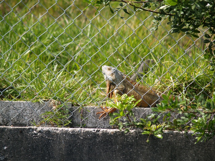 Earlier I headed ashore for a walk and to enjoy the weather on this lazy Sunday. Well, it seems that some of the other “locals” had the same idea. Along the way I saw some large iguanas “catching some rays”. It might look like this guy is “inside, looking out” but he was just staking out his turf through a fence on the side of the canal. “Don’t even THINK of coming near my fence!”