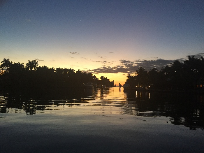 It’s Friday morning the 13th of February. I have never been much for superstition but perhaps it would be best if I avoid walking under ladders, spooking black cats or whatever the “fear du jour” of the day might be. Actually, I feel pretty lucky, the 13th or not, as I look out at the scene surrounding us in this lovely little harbor. Yes, it’s plenty populated, with homes in every direction but the view of the city skyline in the distance is amazing. This was the view that we enjoyed to the west as the sun set last evening.