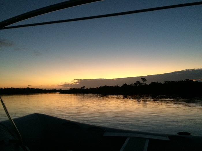 So, we entered the creek at dead slow and crept our way inside.  Unfortunately, the tide chart I was using didn’t appear to be correct as it was actually dead low instead of two hours into the flood that was predicted.  I suppose that we shouldn’t have been surprised as tides can vary a lot depending on wind direction.  Alas, all went well and while we ran aground while anchoring (again) we were all settled by the time the sun went down.It was very nice to have a view of the mangroves and yet being far enough away so that the no-see-ums weren’t able to find us.