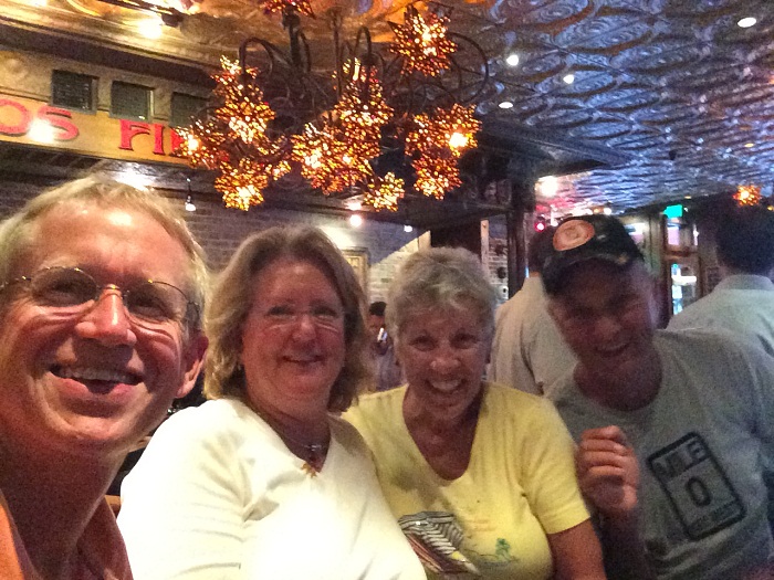 Anyway, so last night we got out the cruising guide and made a tentative list of places we want to visit on our way north. Our first stop, where we are now, is West Palm Beach, the home of the best public docks we have seen yet. The downtown area is beautiful and there are loads of places to eat out. We ran into friends of ours Jim and Joan aboard Jade, who we have seen off and on over our years of cruising. We had a great time out for dinner at a neat Mexican place, Roco’s Tacos. Don’t we look happy? A bit too much perhaps. Yup.