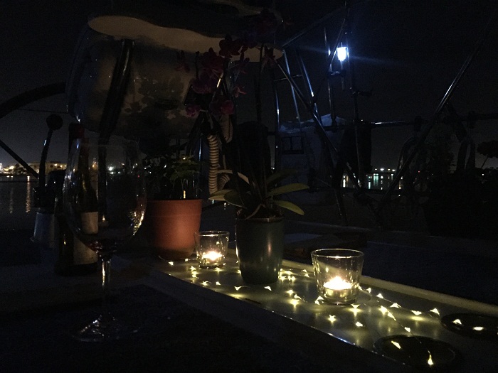 After dinner we enjoyed watching the city lights play on the flat calm water.