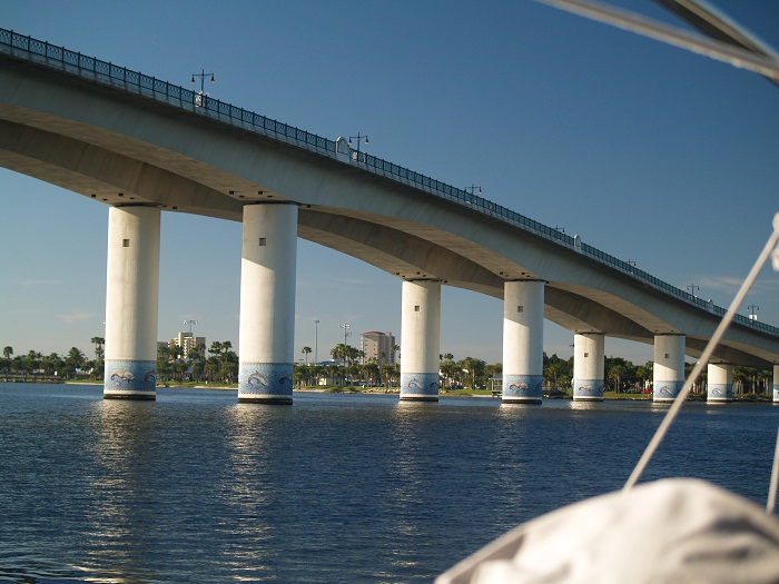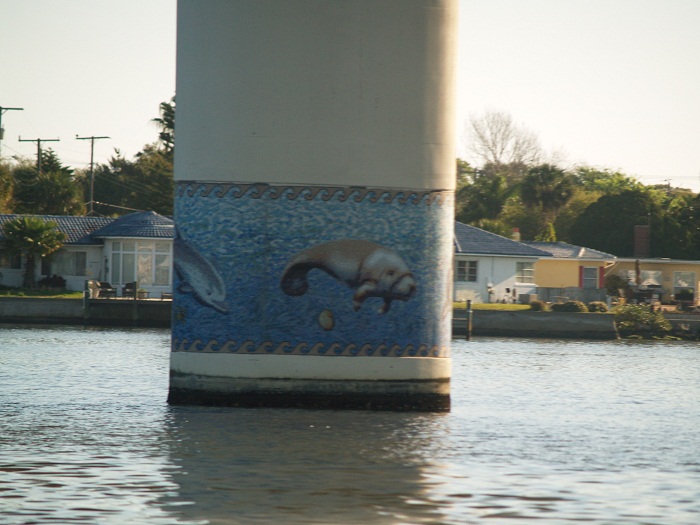 Anyway, one of the fun parts of the ICW is seeing all the sights along the way. My father used to enjoy bridges and his honor, I do to. This bridge in Daytona is quite nice. How about the mosaic work on each piling?