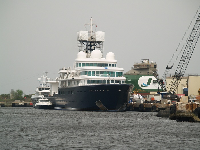 Along the St John River we passed a ship yard with an impressive number of mega-yachts in for refit. This one is 300′ long. Huge. And it certainly wasn’t the only one but I think it was the largest. The “tender” along side was over 40′ long. There were four “gynormus” cranes that pick up such things. I can only imagine what one does to make that sort of money.