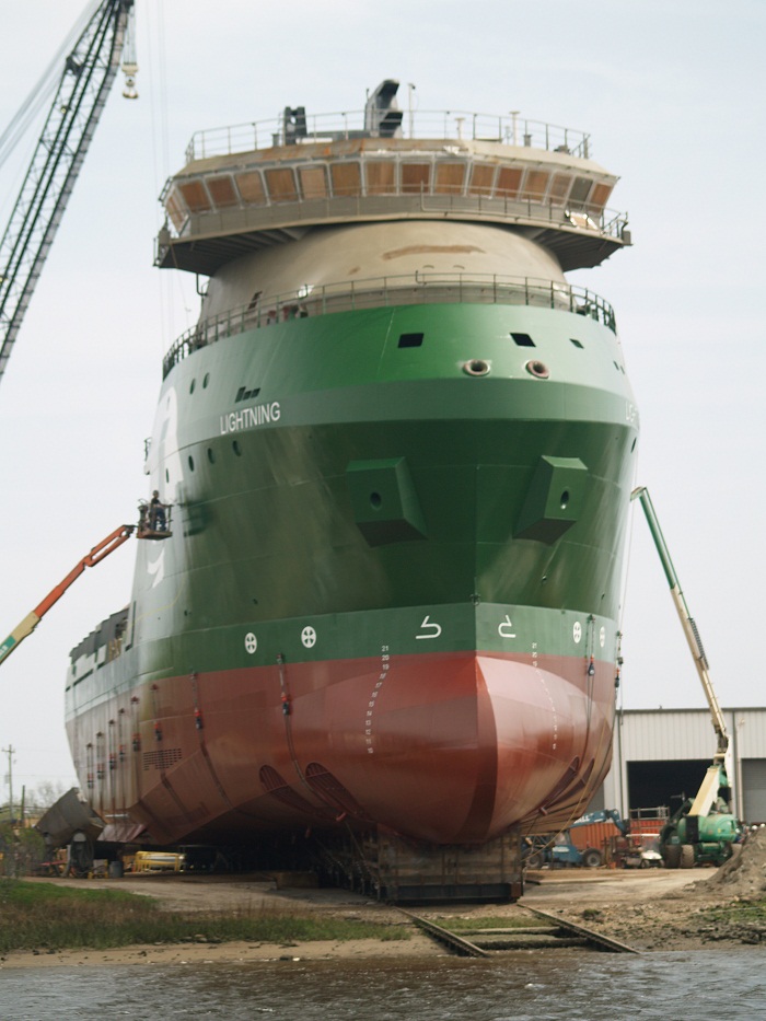 There were some commercial ships under construction. This certainly looks like a “go anywhere” vessel. Note the twin bow thrusters? They are about 8′ in diameter. Pretty tough looking vessel. A tug, I think.