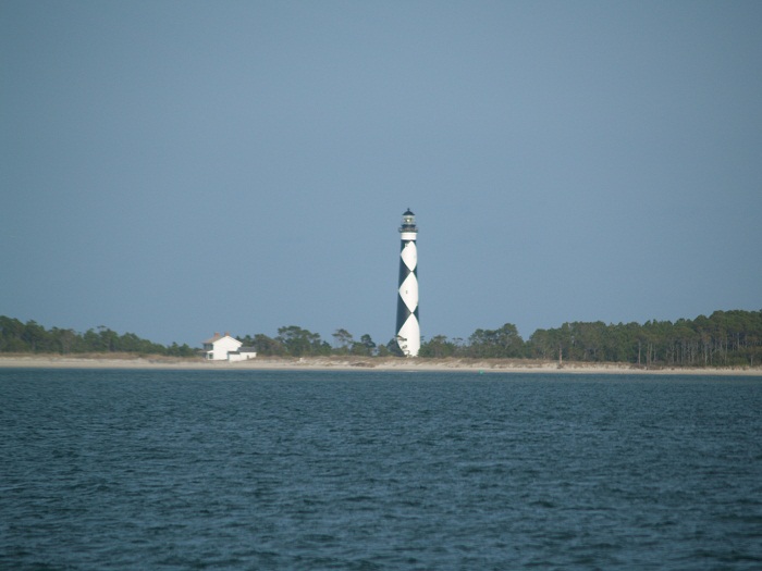 It’s Tuesday morning and we are anchored in the bight at guess what– Cape Lookout.  What a spot.  The lighthouse at Cape Lookout is unique, white with black diamonds painted down the sides.     Cape Lookout is located about equidistant between Beaufort NC and Cape Hatteras.  Actually, to look at a chart you’d think that this was part of Cape Hatteras, which it, sort of, is.  Anyway, a nice place.