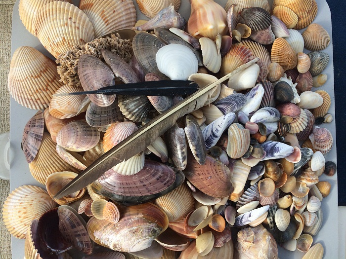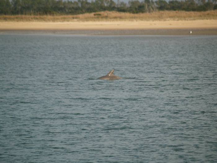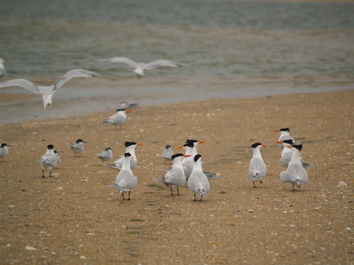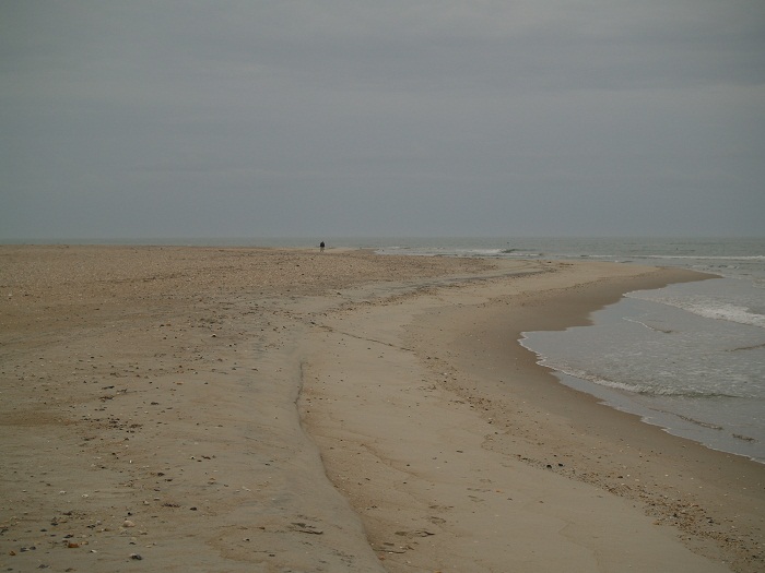 Our visit to Cape Lookout was wonderful, if a bit cool and rainy.  Perhaps that was for the best as the weather certainly enhanced the primeval mood of the place.   That’s Brenda way-out-there…  “Brenda, can you hear me now?”  Nope…Lots of sea birds.  These are migratory terns, visiting from the Arctic, I think. Don’t ask me what type as we left our bird book home in CT.  Oh well, let’s just call them terns for now. Many dolphins visited us while we were anchored.  It’s maddeningly difficult to get a good shot of these beautiful animals.  This is a dolphin fin, in case you can’t tell.  I guess you had to be there.Brenda and I took several walks on the beach, especially to so some shelling.  Of all the beaches we have visited, we have never been on a beach with more shells.  The selection wasn’t that great but there were tons of them.   This shot is of one particularly rich area.  Loads and loads.  “Bob, is the picture upside down?”  Not sure. With the exception of a few campers we had the beach to ourselves.  No exaggeration, the beach went on for miles.   Pretty amazing.  Why someone would choose to camp on sand is a mystery to me.  Sand on my feet is bad enough.  Sand EVERYWHERE… Yuck!.  .