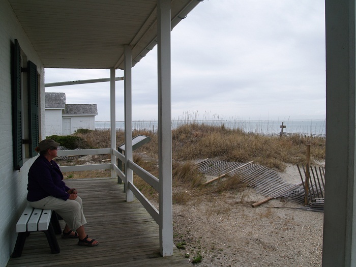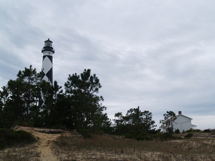 Nice haul…What a great lighthouse and newly painted. Brenda “set a moment” on the keeper’s house, now museum.Back in the “pre GPS” age, mariners would spot a light during the day and to help them identify, sort-of where in the Hell they were, each was painted with a distinctive pattern.  Cape Lookout light, all 185’ of it, was painted with a very distinctive diamond pattern.  The white diamonds were oriented north to south and black to east to west.  Or was it the other way around?  Not certain.  Sure glad that we have a plotter and GPS.