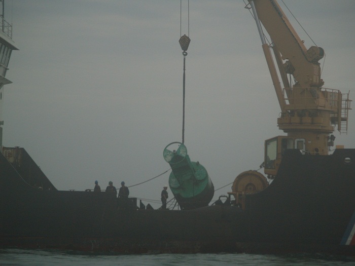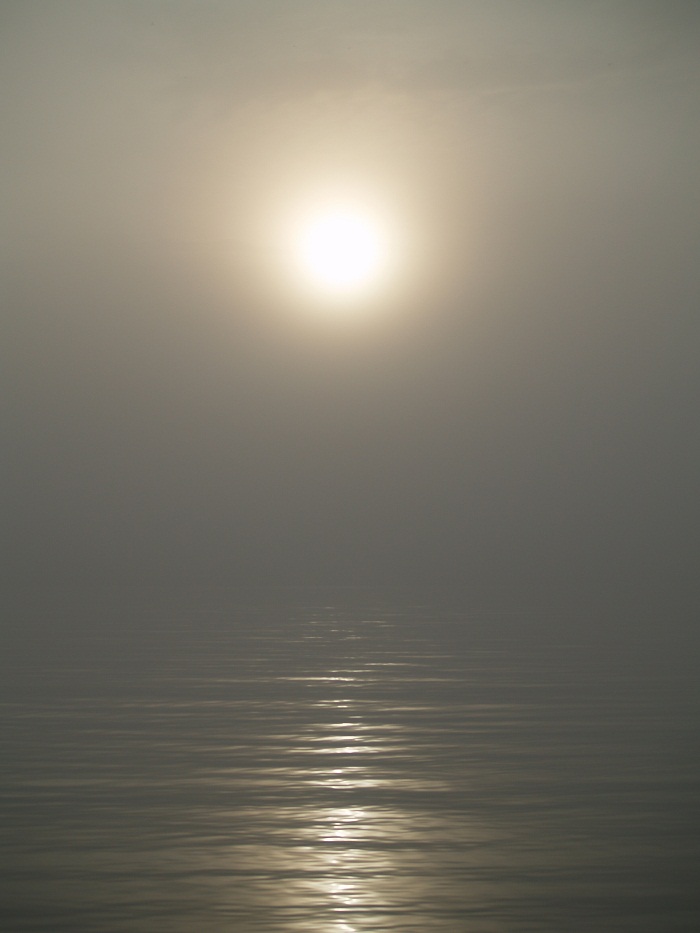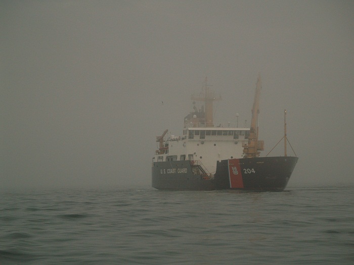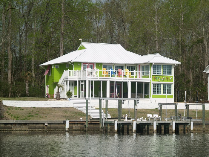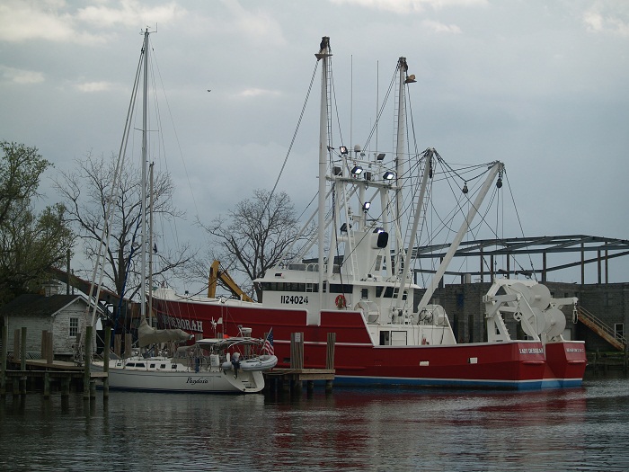 Big painted diamonds on a 185’ tall lighthouse or not, literally hundreds of ships foundered on the nearby shores.   Happily, not Pandora.  However, when we were leaving yesterday morning, we had to pick our way out of the bight in fog with a visibility of about ¼ mile for the 6nm to Beaufort Inlet.    The sunrise was spectacular.  At least I think it was the sunrise.  Hard to say in the fog.We had heard on the radio that the Coast Guard was re-positioning markers in the Beaufort inlet so we were cautioned to be particularly diligent as we came up the channel.   I wouldn’t want to bump into them.  The ship made the huge marker look positively diminutive.  Either that or the people on deck were Lilliputians.   Hmm…It wasn’t long before the ship faded into the fog.As we made our way through the marsh, north of Beaufort, we enjoyed watching the homes go by.  “Dammit Gladys, why does everything that comes into this house have to be in frigging primary colors?”  Anyway, we are now in Oriental, home to “free docks”.  Now, that’s not something that you see in Martha’s Vineyard.   Nice dock tucked next to the commercial docks.  Can you say “big red boat”.   Sure makes Pandora look teeny.We met a nice gentleman across the dock from England who “crossed the pond”  a while back and is now sailing in US waters with his black kitty.   Mogs, a cute little boy kitty, visited Pandora and perched on the sail cover.  Nice kitty…We couldn’t tell if this tern was scolding Mogs or asking for cheese and crackers as he “stared us down” from a nearby piling.So, here we sit, aboard Pandora in lovely Oriental NC, a stones throw from New Bern, where we are headed tomorrow.  I have to say that we Brenda and I are getting a bit nostalgic knowing that we will soon be separating ourselves from our life aboard Pandora, something that has consumed much of our time for years.