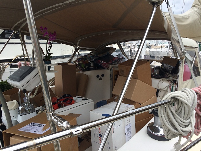 It is remarkable what can accumulate on board a boat over 7 years. Canned goods, soup…I can’t tell you how much soup I found. Spare parts. This is a shot of just some of the stuff that I had packed away for a rainy day. Yes, it was nearly this bad.
