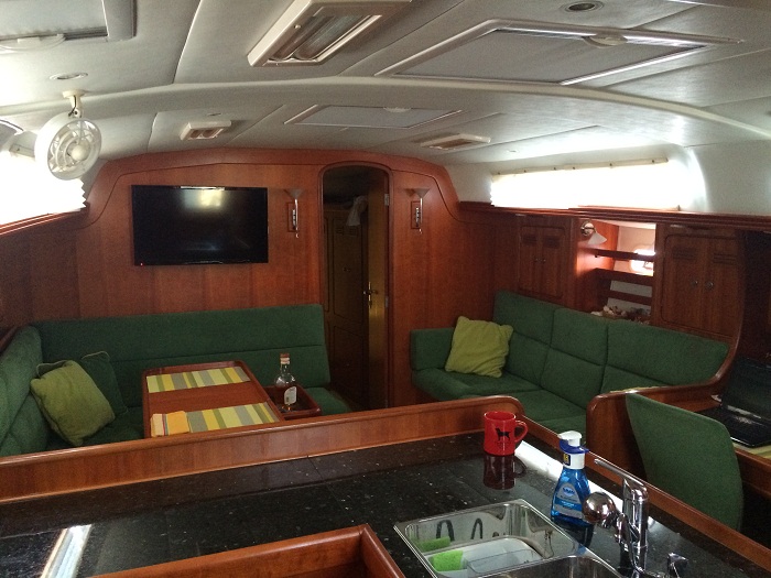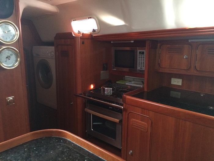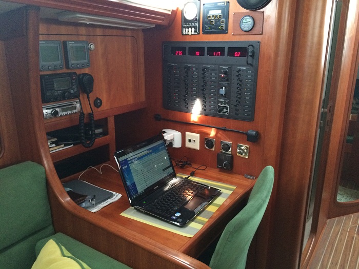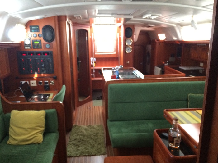 Here’s the main salon looking forward.  It’s cavernous compared to our last boat as she is 14.5′ wide verses 12 for “Pandora”.  You wouldn’t think that the extra 2.5′ would make that much difference, but it does. The same view looking aft.There’s a very nice nav station with a proper seat that swings out.    And, there is even room for my sideband radio.The galley is really nice with granite counter tops.  Interestingly, they are granite