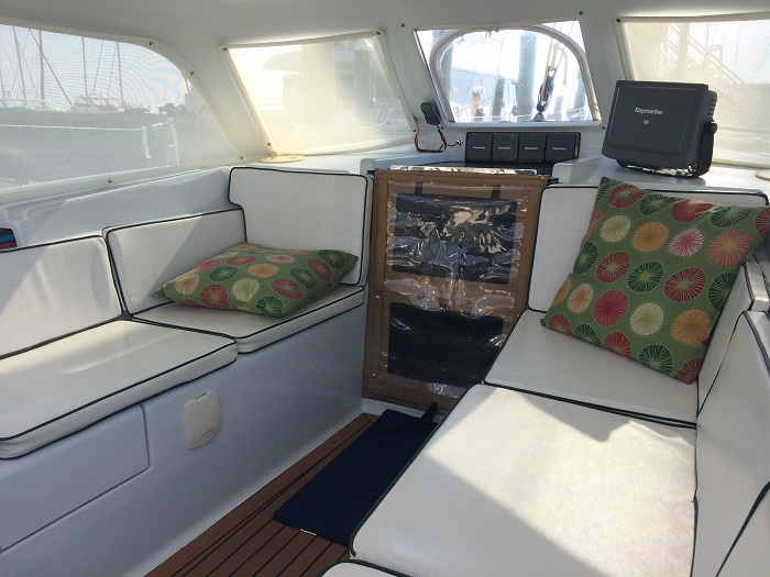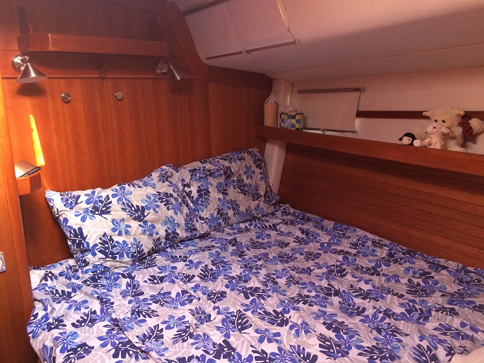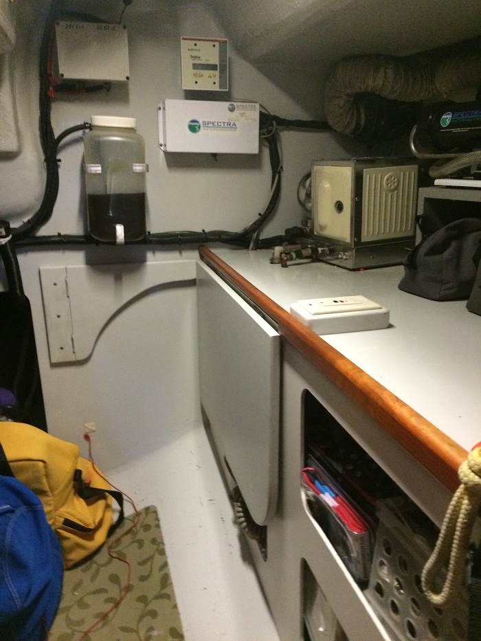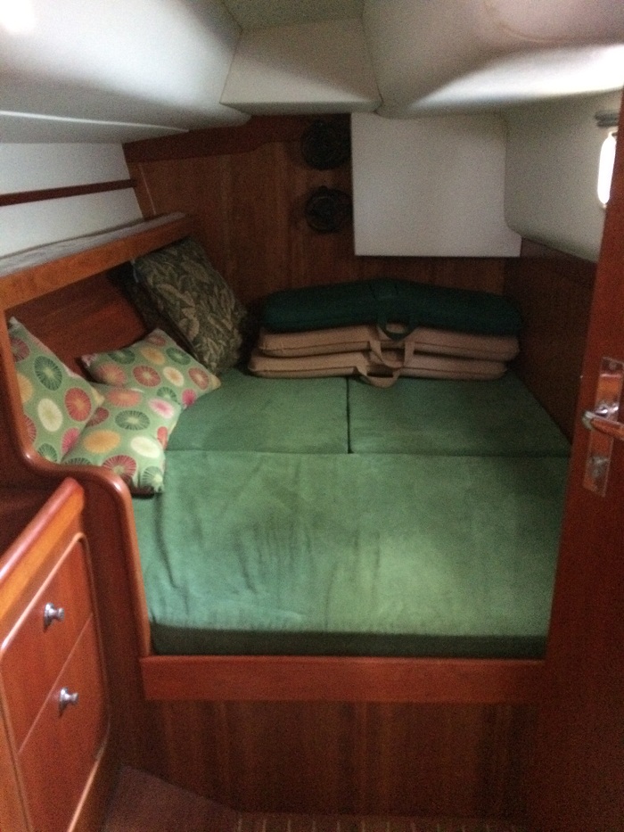 “veneer” over a honeycomb base, the sort used on luxury aircraft and they are very light weight.  Notice the washer in back.  I think it can be used with the inverter for washing but certainly not for drying when we aren’t on shore power as the house batteries total over 100 AH.   Brenda’s pretty excited about that, the washer, not the batteries, that is.  The aft cabin is at the bottom of the companionway to starboard.  Here’s the entrance to the cabin.The aft cabin is quite large and has loads of storage under the bunk as well as drawers and a generous hanging locker, one of five on board.  “Pandora” had only one.The forward cabin, the one that Brenda and I will use, has loads of storage and the bunk is a bit larger.  And, believe it or not, there is even a small workshop that has storage to swallow up a huge amount of stuff.  The owner was fastidious about keeping spares on board and there appears to be a backup for nearly every pump etc, aboard. That’s encouraging.  Yesterday I went through everything to get a feel for what was there.  The amount of stuff is a bit overwhelming but will certainly come in handy at some point.  Alas, no spare muffler…And, last but not least, the hard dodger is wonderful and long enough to lay down out of the weather.   It’s a great spot to tuck up in when the going gets rough.  There’s even a remote plotter so you don’t have to stand at the helm to monitor where you are and a remote for the autopilot.  There are instruments for everything at the helm and repeater instruments under the dodger, at the nav station and there’s even a repeater in the master cabin.  I can’t imagine the complexity of all of this.