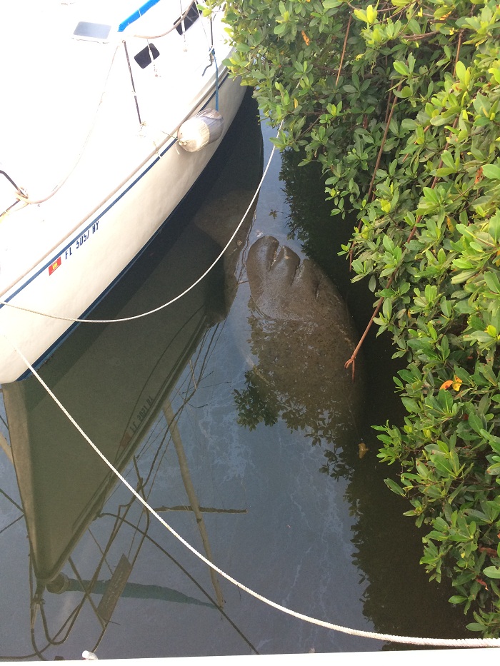 One more thing before I break.  I saw this manatee sleeping near a boat the other evening.  There are several living in the area but this one should certainly be easy to spot with the “prop scars” on his back.  He’s nearly 10’ long.  Huge.  With all the boat traffic in their home waters, it’s remarkable that any survive. Well, I guess that’s about all I have today but there’s plenty to keep me occupied between now and Sunday when my crew arrives, to get the boat ready for the run north.  Let’s hope I can get everything done in time.