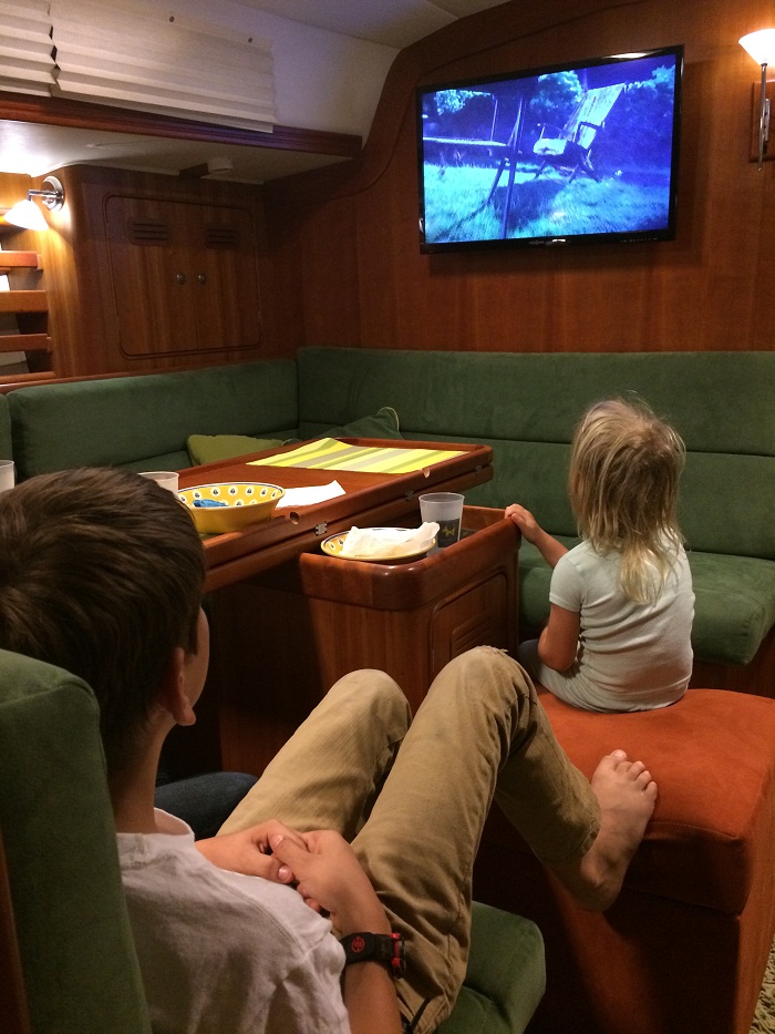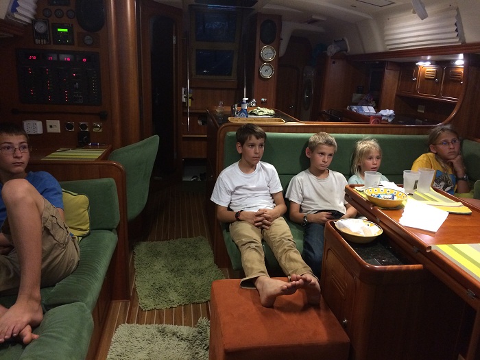 As Brenda has headed home to CT, I am alone aboard and anyone that knows me knows that I am not too big on the “alone thing”.    I was also thinking that it might be tough for Tanya and Jay to find someone to watch five kids so that they can get some alone time.  Yes, their oldest Ely, is old enough to watch the younger ones, but with me on the scene the parents could go a bit further afield and enjoy a night on the town “grownup style”.  Anyway, I offered to have the five kids over for a movie night on Sunday.  It was a real treat, let me tell you.