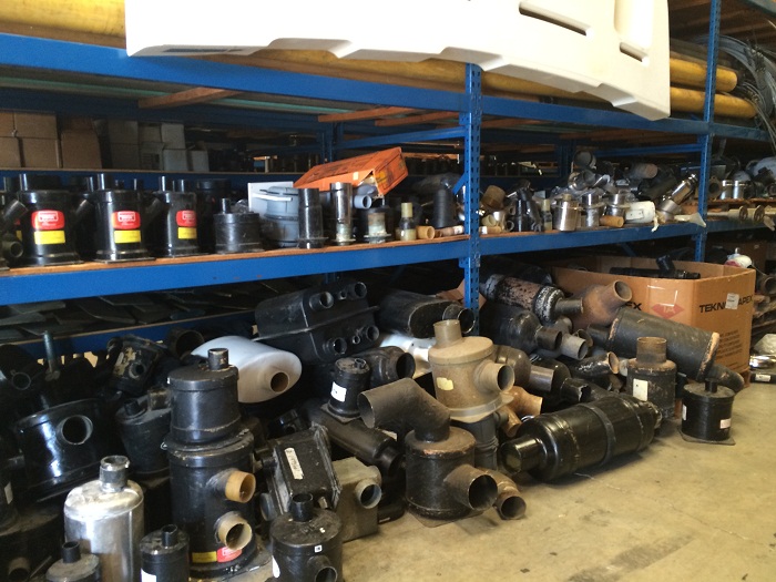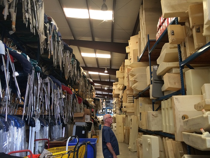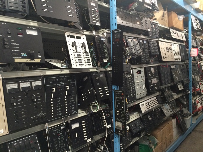 Anyway, imagine “used” marine equipment that would fill a small Walmart.  A ton of stuff.  The first thing you see as you enter the parking lot is hundreds of bimini frames, center console stations and dozens of huge fuel tanks all stacked up in rows.   And, they are all unused and look brand new.  I would expect that it would be a lot less expensive to have something modified to fit a boat from one of these as opposed to building one from scratch.  Take your pick. Need some instruments to put in that nice, shiny, and new center console boats?   Take your pick…from hundreds, all new.Don’t want to drill all those holes?  How about a full panel system?  Yeah, they have em.How about a propeller to round things out?Electrical panels?  Hmm… so hard to choose.I wish that I had known about this before I bought my new muffler the other day. Alas, they didn’t have one that would have fit. I checked, of course, while I was there just to torture myself.  Of course, you need shade.  Bimini anyone?  Water tanks?  The list goes on and on…  That’s my friend Carl.  He was hard at work choosing and he doesn’t even own a boat.  But, perhaps he can make one from spare parts.  So many choices.    I have no idea what was on this row.  However, I am sure that it would all come in handy.    Anyway, you get the picture.  This place is sort of the guy version of a shoe outlet.  “Oh honey, wouldn’t this pair of speedos look perfect aboard?”  “Whatever… “
