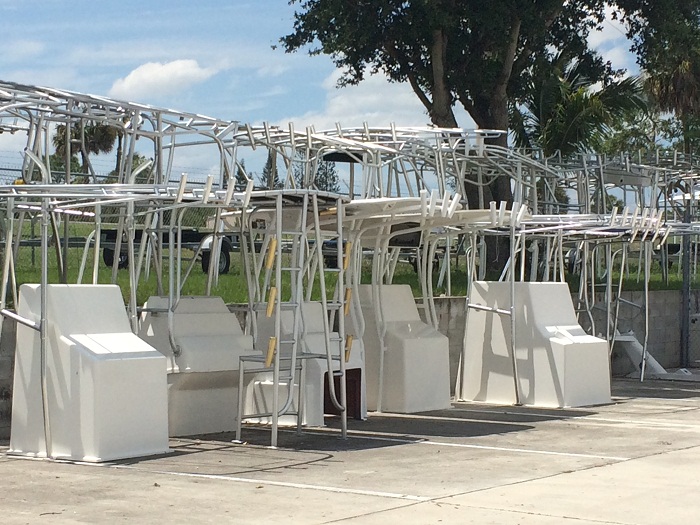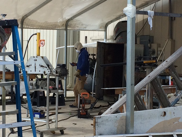 As is the case at most shops that I have seen in FL, the fabrication area is outside here.  It looks chaotic but they do very nice work here.  Note the welder’s clothing.  The locals that work outside take sun exposure very seriously and cover up every part of their body.  Tourists could learn a thing or two from them.   They say that “there’s no such thing as a good tan”.   With my yearly derm visit, I have to agree.