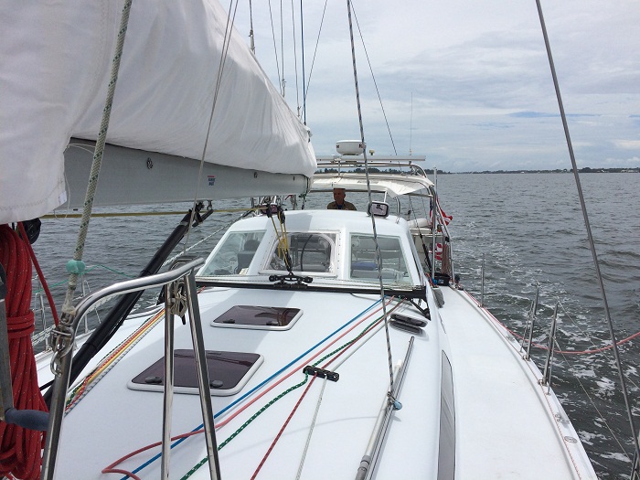 Here’s Jim steering away at the helm. Love that hard dodger.