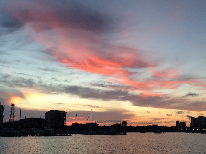 It’s Thursday and we just passed Cape Canaveral on our way north on the ICW. We stopped last night in Cocoa and enjoyed a brief walk ashore (and a beer too, of course). After a few days of rain we were happy to see the sky clear up but there were enough clouds remaining to make for quite a show at sunset.