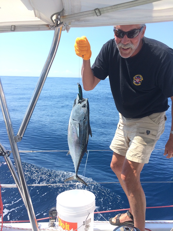 However that wasn’t until the second night when the wind piped up to around 25kts so we were able to make a nice meal out of the tuna we caught on day one. Here’s Jim with the catch of the day.