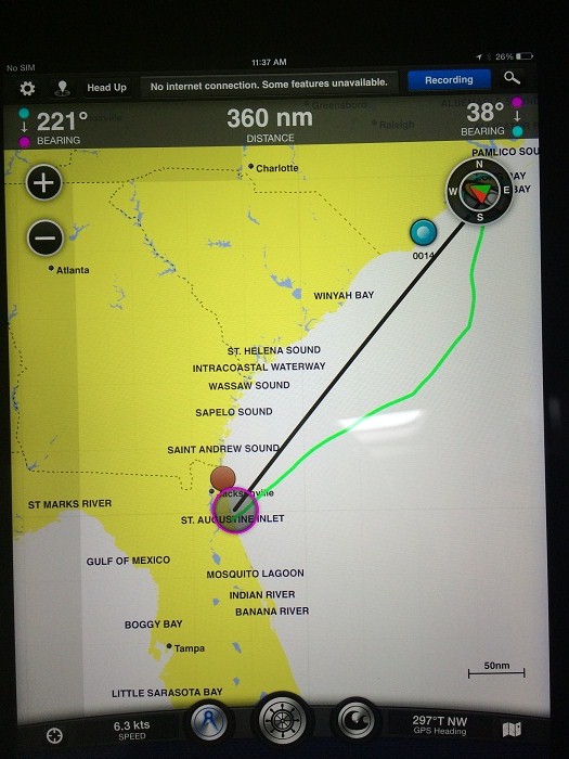 Also, to head out over 100 miles from land, right off of the bat, on a boat that I had never sailed, not even once… The green line is our actual course, which followed the Gulf Stream, for maximum favorable current. The black line is the point to point run.